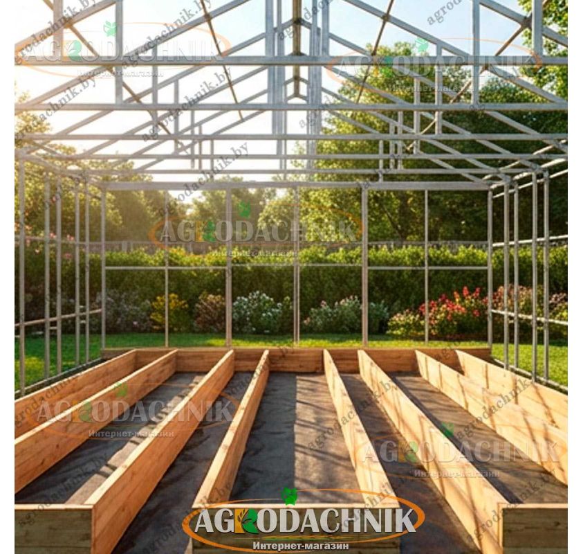 Чтобы перекрыть пролет в 5.5 метра без промежуточных опор, требуется мощнейший скелет. Каркас "Агронома" изготовлен из цельногнутой профильной трубы 40х20 мм (стойки и фермы).