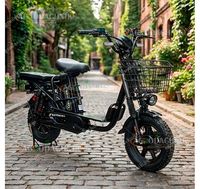 Велосипед полностью готов к дорогам: есть зеркала заднего вида, поворотники, громкий сигнал и мощная оптика. Также предусмотрена вместительная корзина спереди и электронная сигнализация.