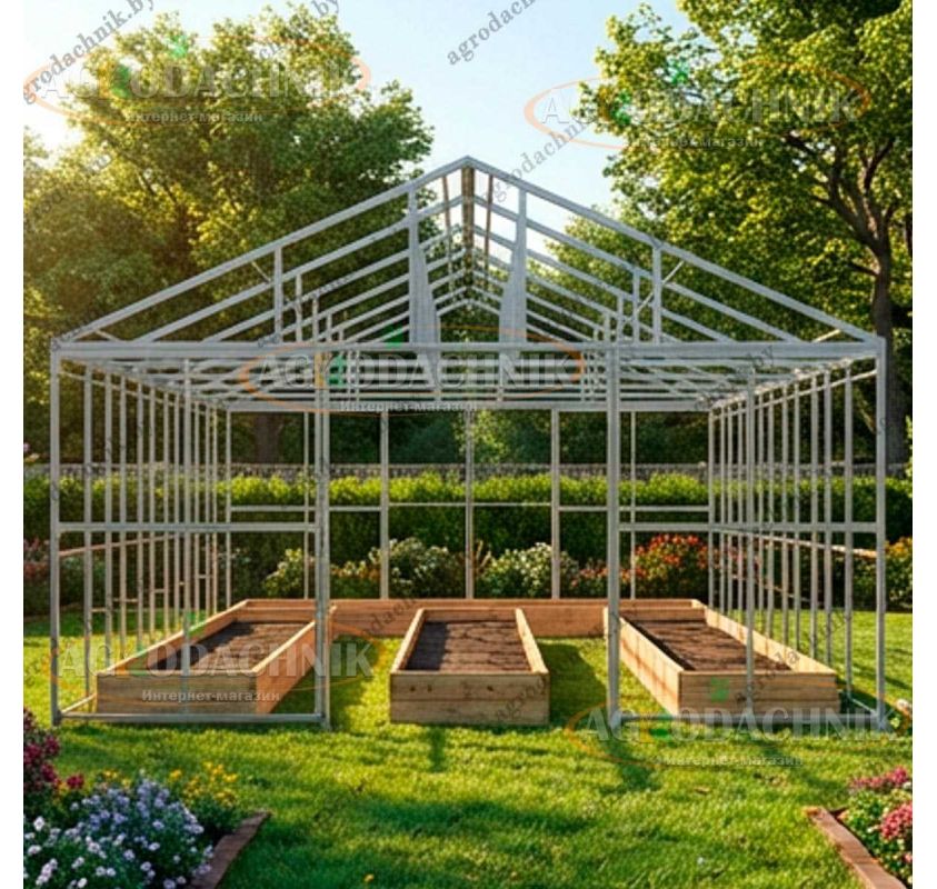 Огромные пролеты требуют соответствующей жесткости. Каркас "Агронома" целиком изготовлен из усиленной оцинкованной трубы сечением 40х20 мм. Вертикальные стойки переходят в мощную стропильную систему двускатной крыши ("домиком").